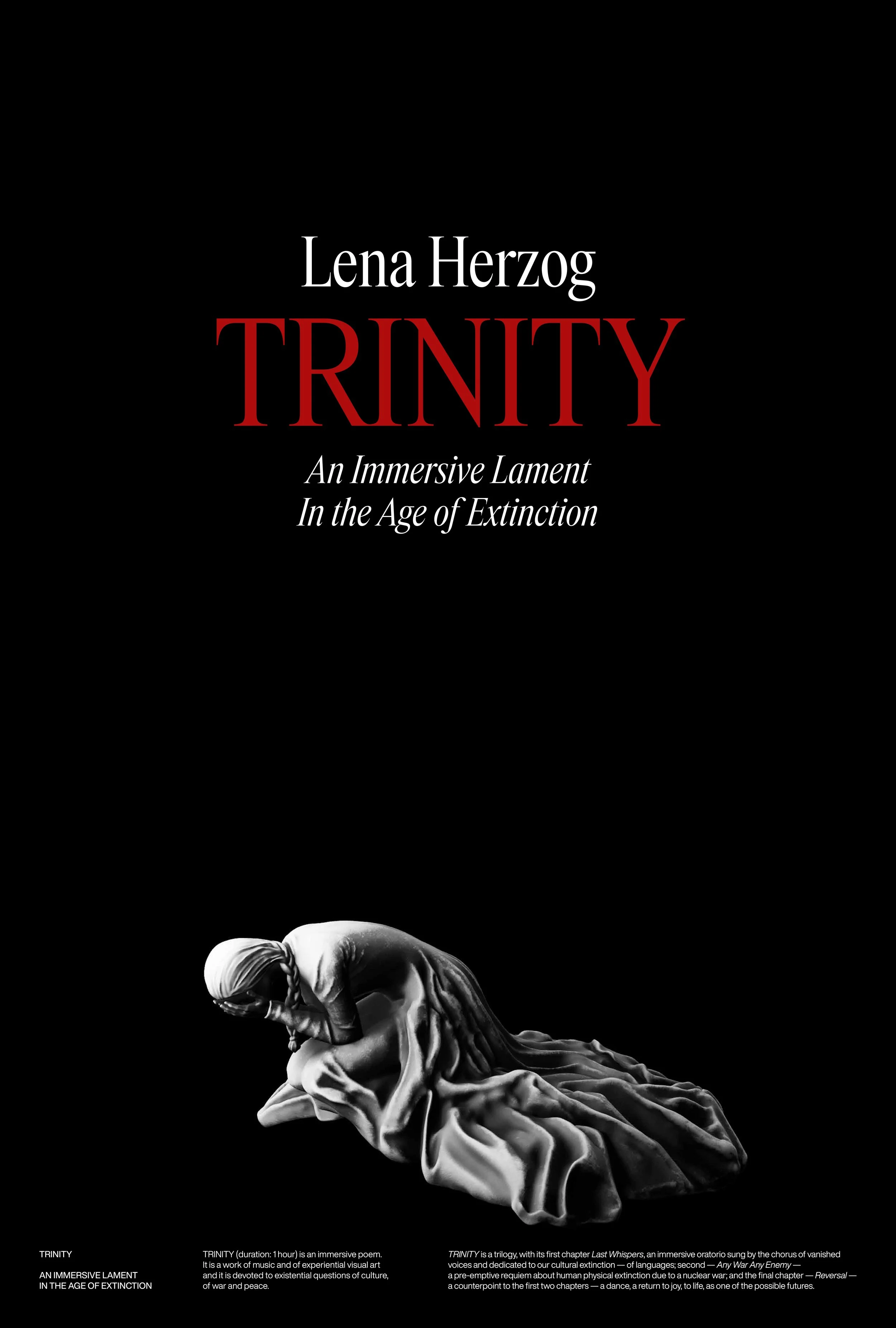 TRINITY is a trilogy, with its first chapter Last Whispers, an immersive oratorio sung by the chorus of vanished voices and dedicated to our cultural extinction—of languages; second—Any War Any Enemy—a pre-emptive requiem about human physical extinction due to a nuclear war; and the final chapter—Reversal—a counterpoint to the first two chapters—a dance, a return to joy, to life, as one of the possible futures.